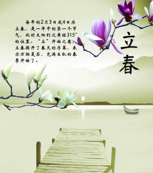 立春是漢族民間重要的傳統(tǒng)節(jié)日之一。“立”是“開始”的意思,自秦代以來,中國就一直以立春作為春季的開始。立春是從天文上來劃分的,春是溫暖,鳥語花香;春是生長,耕耘播種。從立春交節(jié)當(dāng)日一直到立夏前這段期間,都被稱為春天。
