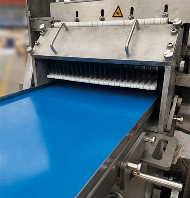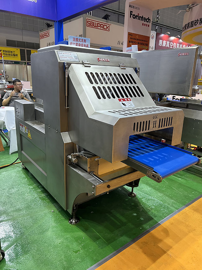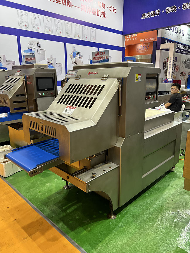 本產(chǎn)品在連續(xù)式切片機基礎(chǔ)上增加圓形刀組,組成二維切割形式,實現(xiàn)凍肉切丁切塊功能,連續(xù)式入料切割,流暢切割出成品肉丁肉塊,切塊切丁產(chǎn)量可達到2-3噸/小時。整套刀組均采用進口材質(zhì)刀片,特殊齒形設(shè)計,使切割更加流暢,成型更加美觀。